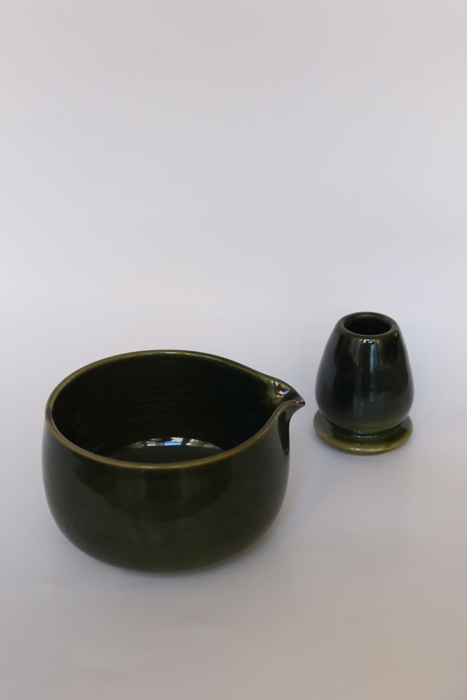 Handgefertigtes Keramik-Set aus Bowl und Whisk Holder in grün glazed. Minimalistisch, langlebig, ikonisch.